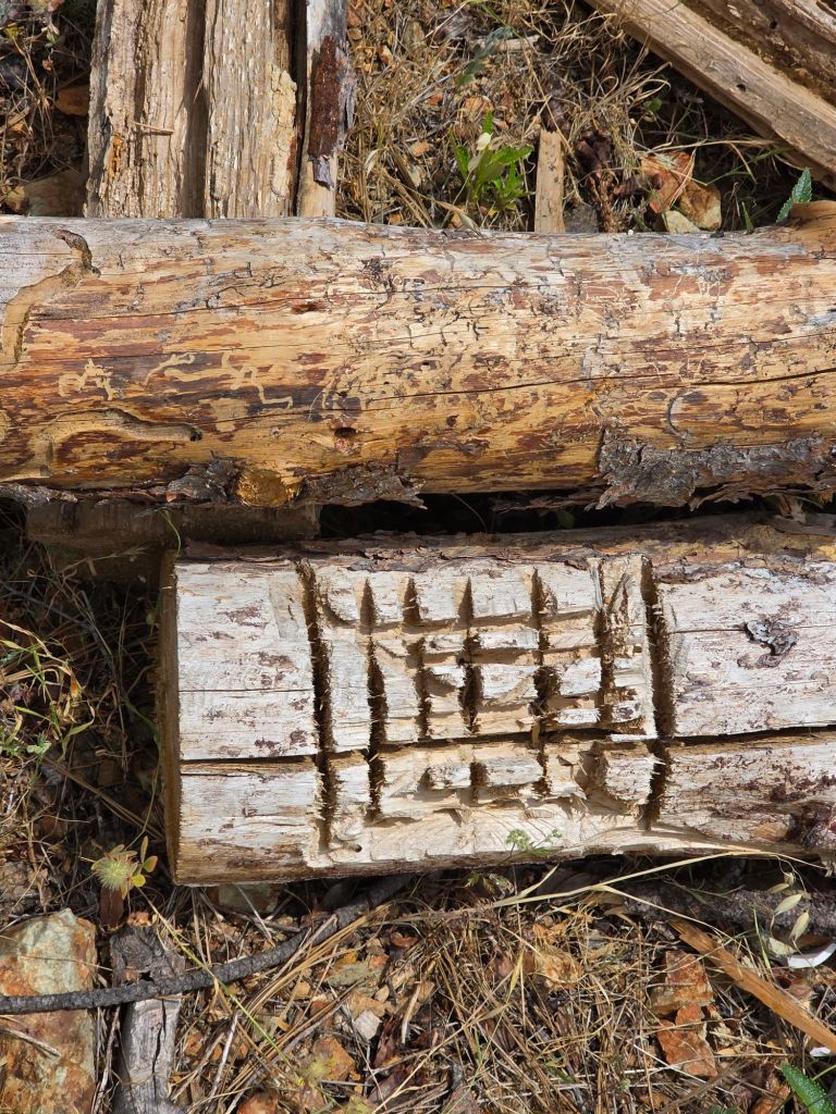 Image is of a dry log where it is laying on the ground with a larger log set next to it across the top. The smaller log is central in the picture frame. With the bark peeled off the top half of the log facing upwards from the ground, there are several scores in the log that look like straight lines. Those marks on the log are where the axe cut through pieces of wood. The under log is split across the length of it and the axe marks create an interesting and uneasy criss-cross pattern.