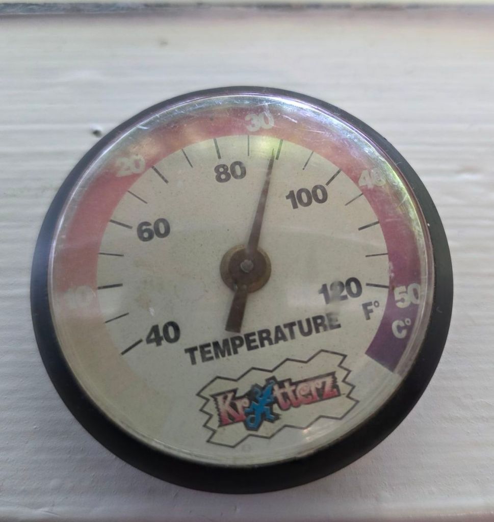 This image is of a round temperature gage. The thermometer is enclosed in a black metal ring with a clear plastic dome covering the temperature dial. Inside the circle is an arch across the top of the circle that goes from light yellow, to orange, to red, and then ends in purple. the numbers underneath the arch start with 40 eith 3 lines representing 45, 50, and 55. Then 60 is written out. As is 80, 100, and 120. The current temperature is shown with a thin black metal dial that ends with a point. The current temperature is 89 degrees.